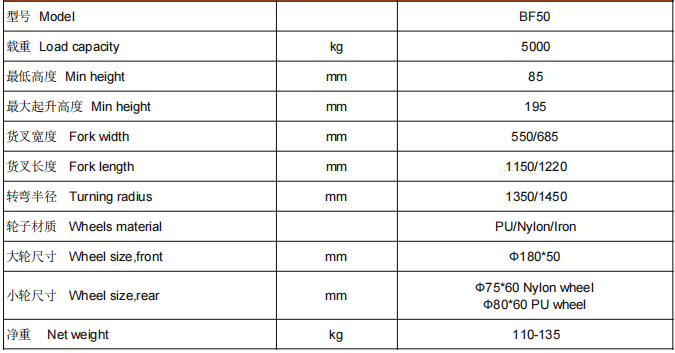 The pallet truck is designed with a spacious fork width of 550/685mm and a fork length of 1150/1220mm, making it suitable for handling different sizes of pallets. Its turning radius of 1350/1450mm ensures excellent maneuverability in tight spaces. The wheels are made of high - quality PU/Nylon/Iron material, providing excellent wear resistance and smooth movement on diverse floor surfaces. The front wheel size is 180×50mm, and the rear wheel size is 75×60mm (nylon wheel) or 80×60mm (PU wheel). With a net weight ranging from 110 - 135kg, it balances portability and sturdiness.